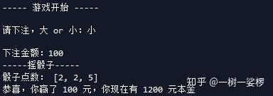 玩家选择下注,押大或押小;输入下注金额;摇3个骰子,11≤骰子总数≤18为大,3≤骰子总数≤10为小;如果赢了,获得1倍金额,输了,扣除1倍金额,本金为0时,游戏结束程序运行的游戏界面如下: