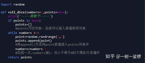 定义roll_dice函数,3个骰子循环次数numbers为3,骰子点数points初始值为空值